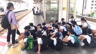四年生が西淀工場の見学に出発しました。野田阪神駅で整列して電車を待っています。