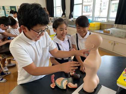 今日は、理科室でヒトの体のつくりについて、人体解剖模型を使って勉強しました!