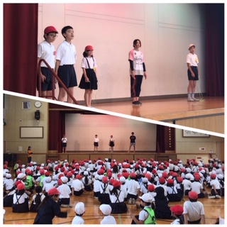 児童集会を講堂で行いました。河崎先生・高橋先生・元氏先生方が参加してゲームを行いました。誰が縄跳びで二重飛びができたでしよう。誰がけん玉の技を長くできたでしよう。など楽しいクイズに班ごとに協力し合い答えていました。