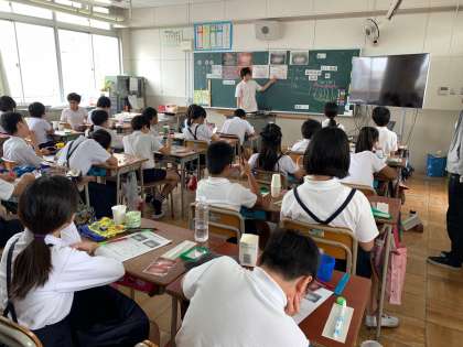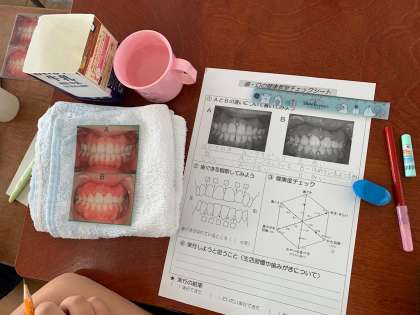 本日6年生が歯と口の健康教室で、歯茎の健康状態のことや自分の歯に付いている歯垢を染色して、歯磨きの仕方を学びました。