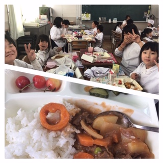 本日は、交流給食を実施しました。6年生1組は、1年生1組と交流給食をしました。日頃、仲良し班でお世話になっているお兄さんやお姉さんと一緒に、ハヤシライスを楽しく食べました。