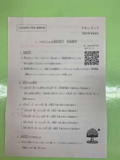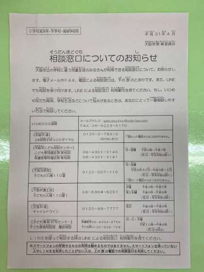 4月に配布いたしました、相談窓口についてのおしらせを夏季休業にあわせまして、再度配布させていただきました。ご確認よろしくお願いします。