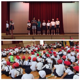 講堂で児童集会を行いました。誰がかくれているでしよう?の児童委員会のクイズに班で協力し合いながら答えていました。