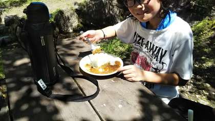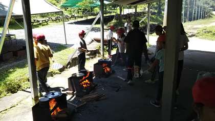 飯盒炊飯でカレーを真剣に作りました。煙たい煙たい中、みんなで涙と汗を流しながら作りました。