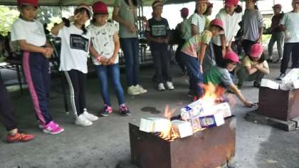 かまどにパックに詰めたパンを置いて、燃やしました!