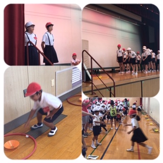8月29日講堂で児童集会を行いました。児童集会では、ピンポン玉を枠の中に入れた数の多さを班で協力する競技を行いました。一生懸命に声をかけて応援していました。