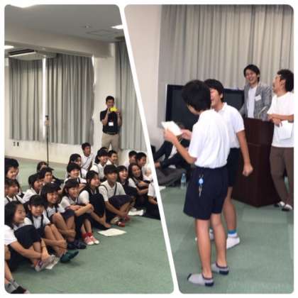 8月30日に2-3時限に6年生で、漫才ワークショップを行いました。各班に分かれて全員がオリジナル漫才を披露しました。最初は緊張していましたが、だんだん盛り上がって爆笑の連続になりました。さすがに、プロの漫才師の指導は、最高です。大谷福島区長も見学に来られ最初から最後まで大笑いでした。