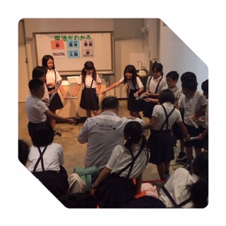 右手にスプーンを持ち、左手には アルミホイルを持ち人間をつないで、人間電池を作りました。