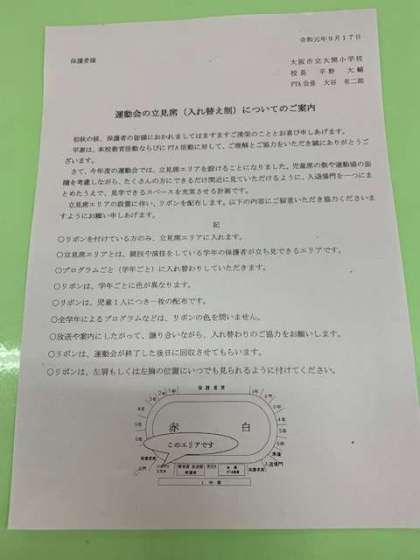 今年度の運動会では、立見席エリアを設けることになりました。エリアの場所とルールについて、記載しておりますのでご確認よろしくお願いいたします。学年ごとのリボンも本日配布しております。