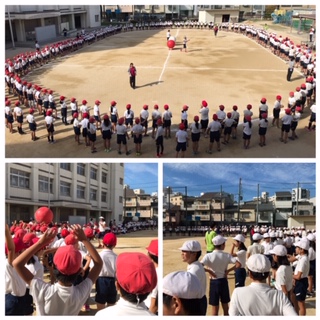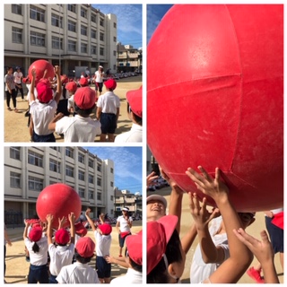 全校児童で大玉運びの練習をしました。みんなで声をかけて、紅白の大玉運びをしました。