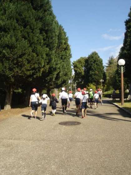 とても広く、緑がいっぱいの公園の中を、たてわり班でオリエンテーリングをしました。ポイントにあるクイズやゲームを班のみんなで協力しながら楽しく解いてまわっていました。