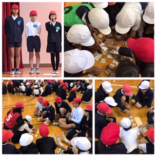 12月5日、講堂で児童朝会を行いました。縦割り班で協力し合って、ひらがなカードを組み合わせてたくさんの言葉を作るゲームをしました。