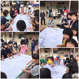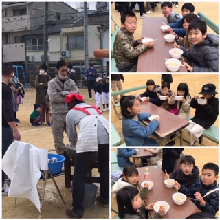 12月8日、大開小学校の運動場で、餅つきが行われました。地域の方々に支えて頂き餅つきや豚汁が振る舞われました。ありがとうございます。