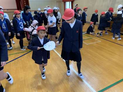 今日は、先週木曜日に行えなかったゲームを児童集会でしました。2つのにこにこ班が協力して、うちわでピンポン球を運びました!とっても楽しかったです!