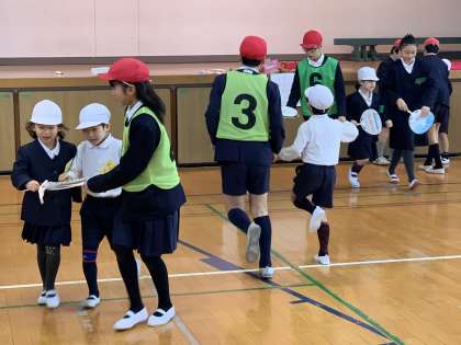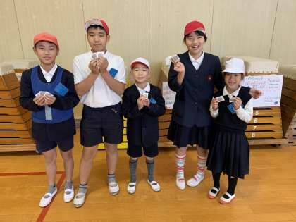 最後のけんけんまるまる運びゲームは、全体で遊びました!1年生と6年生のペアは、青色の1班が最高得点を出しました!