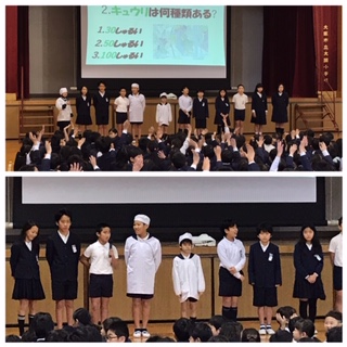 1月16日、講堂で児童朝会を開催しました。給食委員会からのクイズや給食の野菜替え歌の発表がありました。健康の為にも、しっかり野菜を食べてたくましい身体を作っていきましょう。