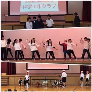 2月13日、講堂で児童朝会を行いました。各委員会の活動の様子の発表がありました。ダンスや卓球や科学工作クラブなど様々な取り組み内容の紹介がありました。