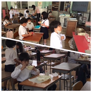 本年度初めての簡易給食が開始されました。1年生にとっては小学校での初めての給食です。手を合わせて、いただきます。
