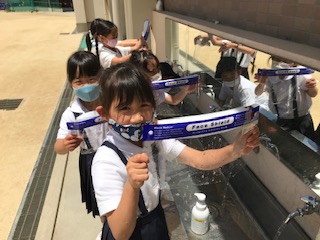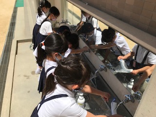 授業でフェイスシールドを活用しました。コロナウィルス感染症拡大防止の為、授業で使い終わったら流水でフェイスシールドを洗って明日の授業に備えます。