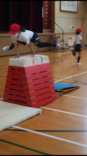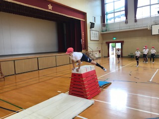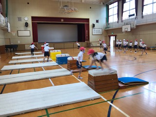 先生からの「跳ぶ時の手の位置に気をつけて」や、子どもたちから「腰を高くあげたらいい」などのアドバイスを受けて、しっかり練習に取り組みました◎