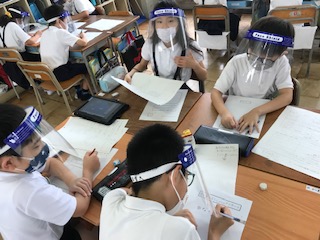 タブレットを使って調べたり、班で相談して新聞の記事にする題材を探したりと、楽しそうに学習していました◎