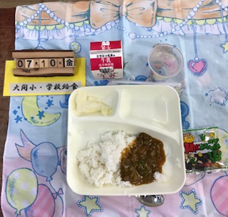 今日の給食は、夏野菜のカレー、きゃべつのサラダ、まめこんぶです。
