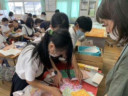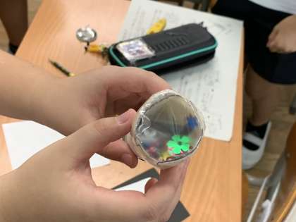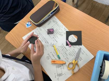 科学工作クラブでは、万華鏡を作りました。筒の中に三角の筒の鏡とビーズを入れ、千代紙で可愛く仕上げました。完成すると子どもたちは嬉しそうに覗いていました。