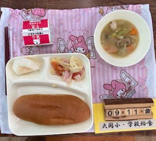 今日の給食は、鶏肉とてぼ豆のスープ煮、じゃがいもとトマトのチーズ焼き、梨です。