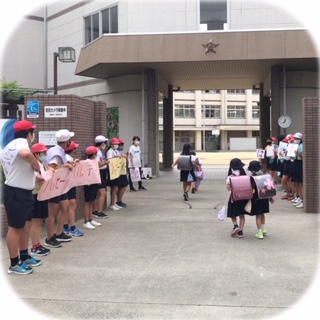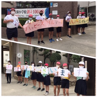 9月16日から、大開小学校創立100周年記念の取り組みとして、ハッピー スマイル デーを開始しました。各学級の代表が正門前で『おはようございます』の爽やかな、あいさつ運動です。世界の国の、おはようございますの言葉をタスキにして、あいさつ運動を行いました。
