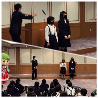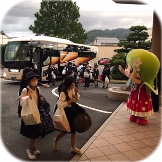 水明荘に到着しました。水明荘のマスコットが大開小学校のみなさんを迎えてくれました。また、開所式では、水明荘の方から思い出に残る修学旅行をして下さい。とお言葉をいただきました。