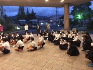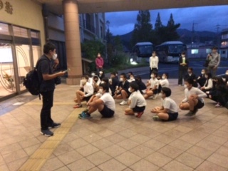 水明荘に到着後、すぐに避難訓練を実施しました。避難場所は、水明荘の玄関付近です。