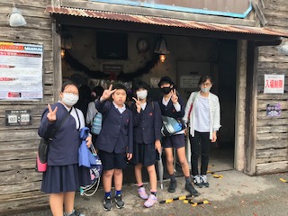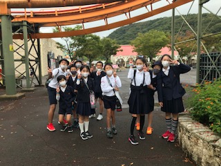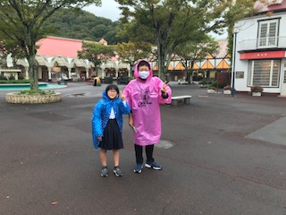 姫路セントラルパークで班行動をしています。みんなで協力して、食事場所や乗り物を決めます。台風の影響で、少し雨が降り出しました。