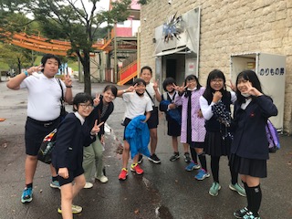 姫路セントラルパークでの班行動の時間も残りわずかになりました。担任の先生と記念写真。ハイ ポーズ