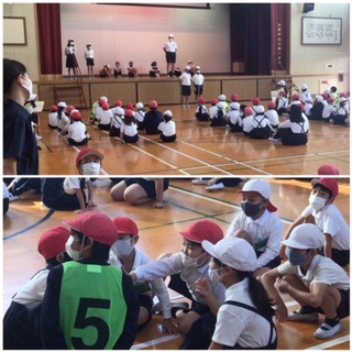 10月15日、児童朝会を2分割して開催しました。全学年の2組が講堂に集まり行いました。児童朝会の委員会のクイズに班ごとに協力し合い取り組んでいました。