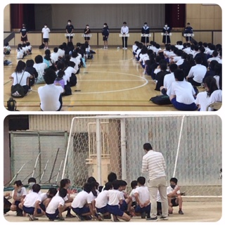 野田中学校で部活動体験を実施しました。大開小学校の6年生47名が参加しました。体育館で部活動紹介がおこなわれました。中学校での初めての部活動体験で緊張しながらも全力で頑張りました。