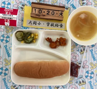 今日の給食は、まぐろのオーロラ煮、ベーコンとじゃがいものスープ、きゅうりとコーンの柚子ドレッシングです。