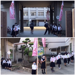3年生の代表が正門前で創立100周年記念のあいさつ運動を行いました。『おはようございます』と爽やかなあいさつをしました。あいさつ運動の旗を持って取り組みました。