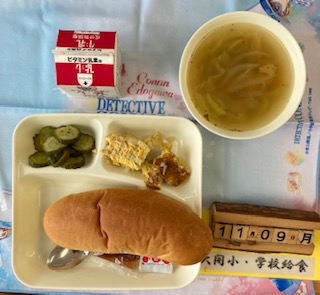 今日の給食はツナポテトオムレツ、スープ、きゅうりのバジル風味サラダです。