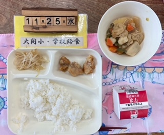 本日の給食は、あげどりのネギだれかけ、ふくめに、もやしのピリ辛和えです。