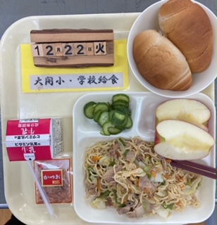今日の給食は和風焼きそば、きゅうりの甘酢和え、林檎です。