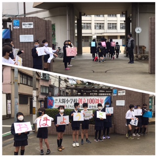 1月27日、大開小学校の正門前でハッピースマイルデー『あいさつ運動』を4年生の代表児童が行いました。『おはようございます』のあいさつが爽やかな朝に飛び交いました。