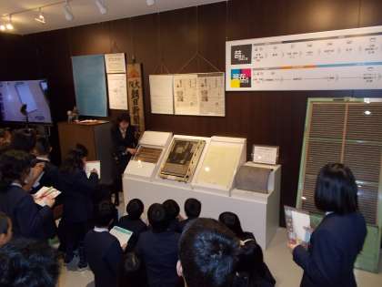 次に、印刷の機械や使われている紙、そして実際にその日の夕刊が印刷されているところを見学させていただきました。ものすごいスピードで新聞が印刷され送られていく様子を見て、子どもたちは驚いていました。