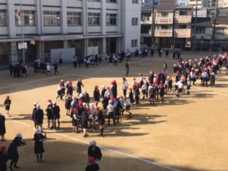 3月11日、緊急事態宣言が解除されて初めて児童集会を行いました。全児童が運動場に集まりゲームを行いました。縦割り班で協力し合い一生懸命に取り組んでいました。
