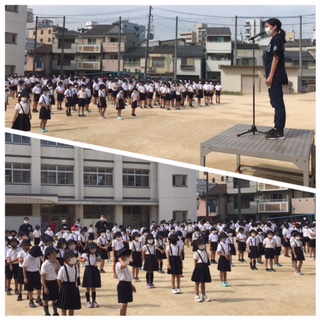 6月28日、運動場で児童朝会を行いました。緊急事態宣言が解除されてから初めての運動場での児童朝会です。校長先生から今週行われる『こども祭り』の話しがありました。オンライン方式の取り組みになります。思い出がたくさん出来るように、友だちと仲良く協力し合い頑張りましょう。また、『つぶやき』新聞の内容も紹介されました。