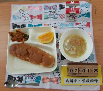 かぼちゃのミートグラタン、スープ、オレンジ、おさつパン、牛乳です。