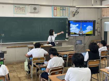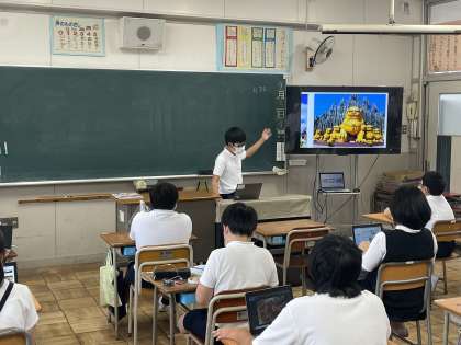 英語の時間には、パフォーマンステストをしました。オールイングリッシュで、自分が好きな国の好きな食べ物や文化などを身振り手振りも交えて発表していました。