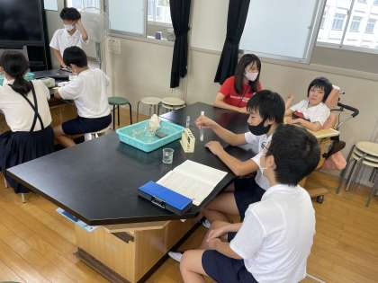 理科の時間には、「塩酸を含む水溶液は、なぜ金属製品には使えないのだろう」という課題の解決のために実験をしました。金属片が溶けていく様子を真剣に観察し、結果の考察をしていました。