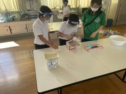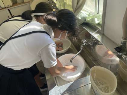 手洗いの洗濯実習をしました。子どもたちは、洗濯に必要な洗剤液を作り、もみ洗い、つまみ洗いをしながら汚れを落とし、しぼって干す作業を丁寧に行いました。子どもたちは、汚れが落ちる様子に満足しながら意欲的に取り組みました。
