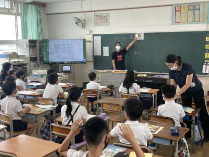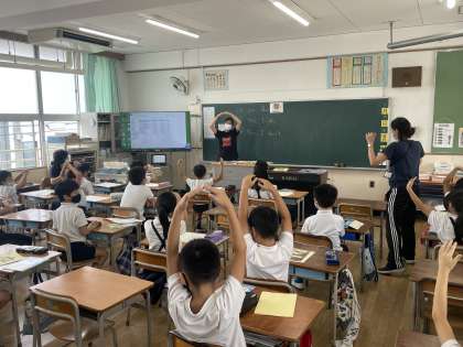 外国語活動の時間に、英語で「Do you like 〜」で聞かれた質問に対して、「Yes,I do」「No,I don't」で答える学習をしました。リズムにのりながら楽しく学習を進めました。