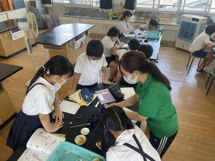 理科では、塩酸等の水溶液で溶け、でてきた個体はもとの金属とちがうのか、という課題で実験しながら学習を進めました。